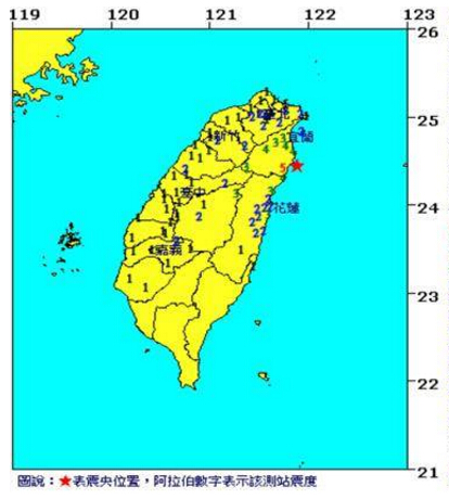 據報道,根據“氣象局地震測報中心”資料,各地最大震度宜蘭縣南澳5級、花蓮縣和平4級,3級地區包括:宜蘭縣宜蘭市、南投縣合歡山;2級地區有:新北市坪林、花蓮縣花蓮市、桃園市三光、臺北市信義區、臺北市、新北市、臺中市德基、新竹縣竹東、苗栗縣三義、云林縣草嶺;1級地區有:基隆市、桃園市、新北市萬里、新竹市、新北市石門、新竹縣竹北市、苗栗縣苗栗市、臺中市、南投縣南投市、彰化縣彰化市、嘉義縣阿里山、云林縣斗六市、嘉義市、臺東縣長濱、臺南市新化。