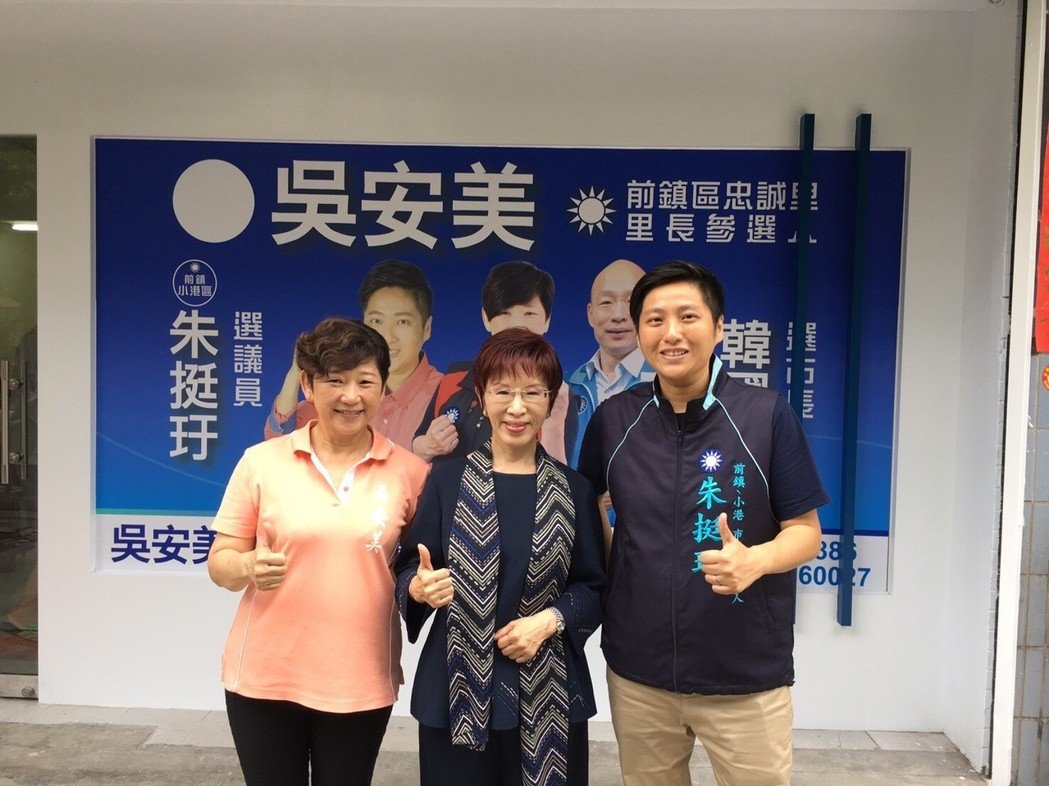國民黨前主席洪秀柱(中)為國民黨高雄市議員參選人朱挺玗(右)和里長參選人吳安美加油打氣。(圖片取自臺媒)