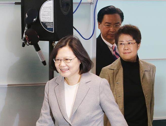 2015年時(shí)任民進(jìn)黨主席的蔡英文(前)在小英基金會(huì)執(zhí)行長(zhǎng)張振亞(中)的陪同下,完成民進(jìn)黨內(nèi)提名參選登記,不難看出兩人的好交情。(圖片來(lái)自臺(tái)媒)