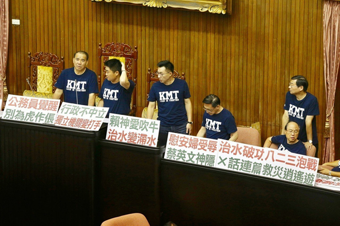 國民黨“立委”在現場擺滿抗議標語,包含“公務員覺醒、別為虎作倀”“慰安婦受辱、蔡英文神隱”“賴神愛吹牛、治水變滯水”“行政不中立、獨立機關變打手”“賴清德綁樁、政策買票7400億”“假新聞真獨裁、箝制新聞自由”;還在地面鋪上“東廠亂政、民主之恥”“促轉惡轉、賴揆道歉”大字。隨后一行人邊開會邊占領主席臺。