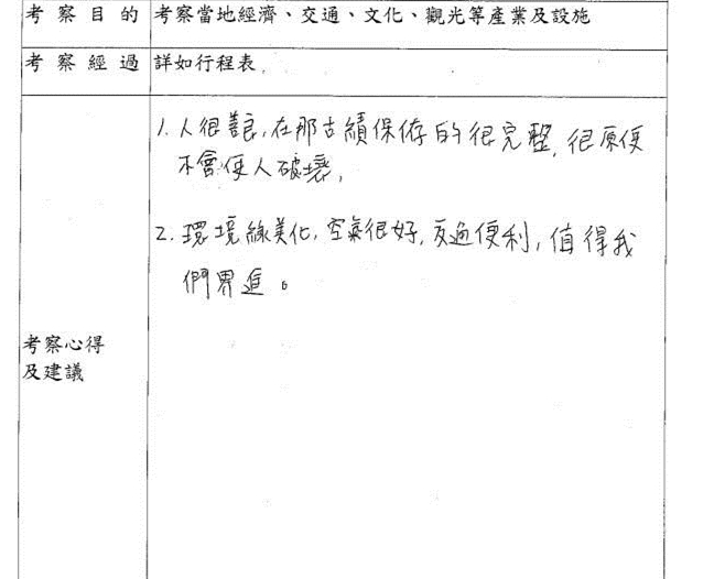 中國臺灣網9月27日訊 據臺灣“東森新聞云”報道,新竹縣無黨籍縣議員嚴永秋去年到歐洲的考察報告近日曝光。他總共到南歐考察13天,但卻被網友抓包回臺的考察報告只寫了42字,且里面一堆錯字,網友看完直呼“我們的縣議員就是這種水平嗎?”