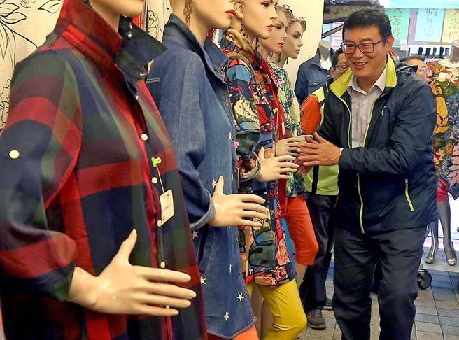 姚文智先前到城中市場和附近商圈拜票,看到整排賣衣服用的假人模特兒,玩性大發向它們一一握手致意。(圖片來源:臺灣《中時電子報》)