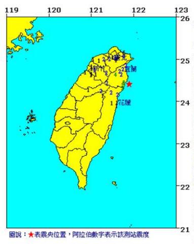 各地最大震度,宜蘭南澳4級(jí)、花蓮和平有3級(jí),宜蘭市、桃園三光、臺(tái)中梨山、臺(tái)北市、新北市也都有2級(jí)。
