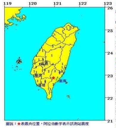 其他地區震度:臺東縣臺東市3級;屏東縣三地門、高雄市桃源、花蓮縣富里、臺中市烏石坑等地區2級;嘉義縣大埔、屏東縣屏東市、臺南市楠西、南投縣玉山、臺南市、云林縣草嶺、嘉義市、云林縣斗六市、高雄市、彰化縣彰化市等地區1級。(中國臺灣網 李寧)