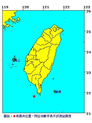 30日23時14分發生規模4.9地震,地震深度44.1公里。(圖片來源:臺灣《聯合報》)