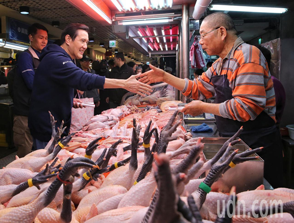 馬英九(左)今天到興隆市場買菜,并發放春聯給攤商與買菜民眾。(圖片來源:臺灣《聯合報》)