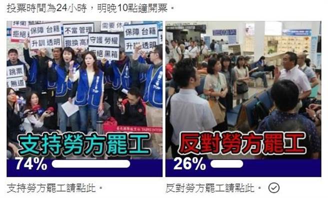 臉譜網(wǎng)不公開社團(tuán)發(fā)起社員投票,支持臺(tái)灣華航罷工占絕大多數(shù)。(圖片來源:臺(tái)灣“中時(shí)電子報(bào)”)