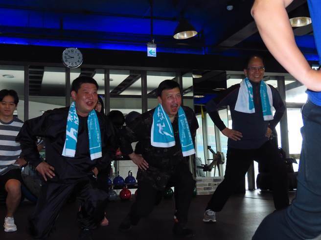 民進(jìn)黨候選人余天(中)5日邀請游鍚堃(右)、新北市議員陳啟能(左),一起到健身房“操一下”。(圖片來源:臺灣“中時(shí)電子報(bào)”)