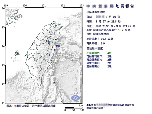 臺灣花蓮縣10日凌晨發(fā)生3.9級地震
