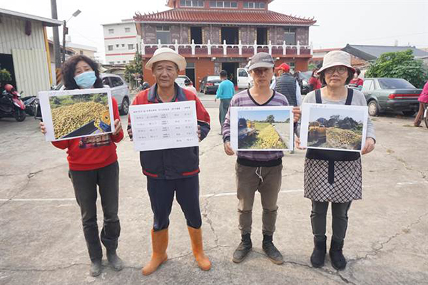 13日下午麻豆柚農(nóng)郭新聰(左二)與其他柚農(nóng)拿出去年照片,證明去年麻豆柚子確實(shí)因產(chǎn)量過(guò)剩賣(mài)不好,個(gè)別果農(nóng)將自家賣(mài)不出去的柚子傾倒在自家果園土地旁。(圖片來(lái)源:臺(tái)灣“中時(shí)電子報(bào)”)
