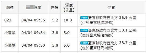 臺東縣今晨連續發生三次地震 最大規模里氏5.2級