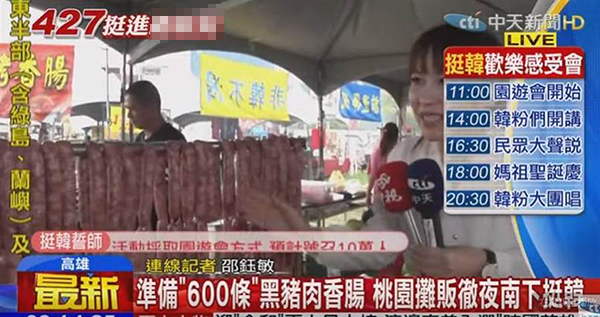 “韓粉”自發在鳳山舉辦市民感受聯誼歡樂大會,力挺高雄市長韓國瑜選臺灣地區領導人,F場再度攤商云集,民眾熟悉的“香腸瀑布”也沒缺席。(圖片取自臺媒)