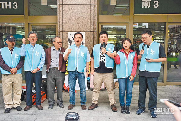 “重啟核四公投”領銜人黃士修(右一)、“核能減煤公投”領銜人廖彥朋(右三)、國民黨副主席郝龍斌(右四)等人舉行“以核養綠”全臺聯署行動記者會。(圖片來源:臺灣“中時電子報”)