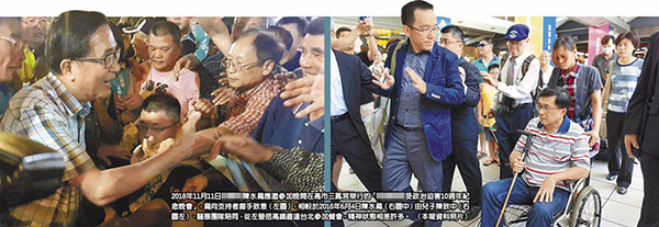 2018年11月11日陳水扁應(yīng)邀參加晚間在高市三鳳宮舉行的紀念晚會,陳水扁向支持者握手致意(左圖)。相較于2016年6月4日陳水扁(右圖中)由兒子陳致中(右圖左)、醫(yī)療團隊陪同,從左營搭高鐵直達臺北參加餐會,精神狀態(tài)相差許多。(圖片來源:臺灣“中時電子報”)