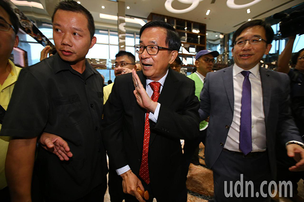 陳水扁下午在臺北舉辦簽書會,陳水扁(中)在兒子陳致中(右)陪同下進入會場。(圖片來源:臺灣《聯(lián)合報》)