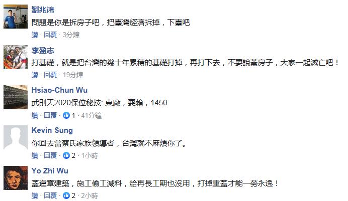 不過臺灣網友對此并不買賬。有網友表示,蔡英文根本沒在蓋房子,而是在拆房子,把臺灣的經濟基礎都拆掉;也有網友批評,蔡蓋違章建筑,施工偷工減料,給再長工期也沒用,打掉重蓋才能一勞永逸。ㄖ袊_灣網 高旭)