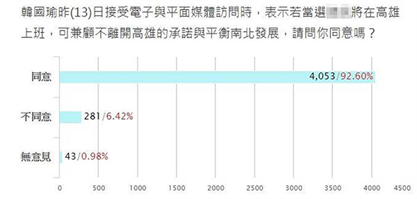 中國臺灣網5月15日訊 據臺灣“中時電子報”報道,高雄市長韓國瑜日前接受專訪時松口表示,愿接受國民黨征召、參選2020,更表示“選上就在高雄上班”。對此,臺灣“中時電子報”昨日(14日)推出網絡投票,廣邀網友參與投票表達看法。截至今天早上七點半,有高達92.6%網友同意韓國瑜當選后在高雄上班,力挺韓國瑜。