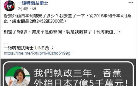 一級嘴炮技術(shù)士在臉書上打臉蔡英文,他說,“香蕉外銷日本到底賣了多少?他去查了一下,從2016年到今年4月為止,總金額是2億2452萬2000元”。一級嘴炮技術(shù)士制作一圖諷刺,相差5億多,如果不是假新聞,就是他漏算了“臺灣價值”。