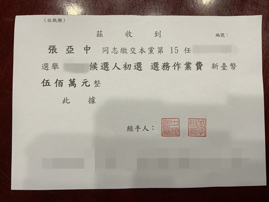中國臺灣網(wǎng)6月6日訊 據(jù)臺灣《聯(lián)合報》報道,國民黨下周一公布2020初選名單。臺灣大學(xué)政治系教授張亞中今(6日)上午10時整,委托秘書到國民黨中央繳交5百萬(新臺幣,下同)選務(wù)作業(yè)費(fèi),其中2百萬現(xiàn)金3百萬本票(253萬與47萬各一張),組發(fā)會與財務(wù)室現(xiàn)場完成點(diǎn)收,確定已取得參選資格。
