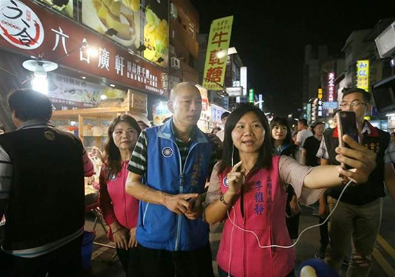 時任國民黨高雄市黨補主委的韓國瑜(中)曾率李雅靜(前排右)、陳玫娟(左二)等10位國民黨市議員前往六合夜市拜訪攤商,探詢生意情況,李雅靜還以手機現場直播。(圖片來源:臺灣“中時電子報”)