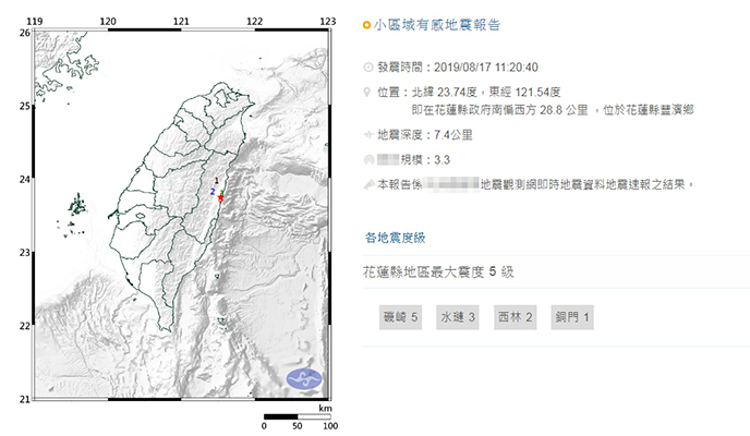 今天上午11時20分,在花蓮縣政府南偏西方28.8公里處發生里氏規模3.3級有感地震。(圖片取自臺媒)