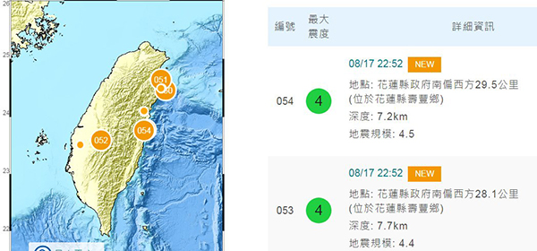 中國臺灣網8月18日訊 據臺灣《聯合報》報道,臺灣花蓮昨日(17日)晚間22點52分隔5秒連兩震。臺灣“中央氣象局”昨晚連續發布兩次地震報告,前者是22:52:05發震,規模里氏4.4級,后者是22:52:10發震,后者規模里氏4.5級。