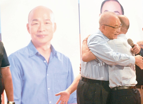 韓國(guó)瑜與吳敦義合體,相互擁抱,用行動(dòng)突破“換瑜說”(圖片來源:臺(tái)灣《聯(lián)合報(bào)》)