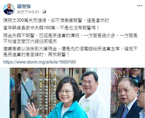 羅智強在臉譜網(facebook)發文說,“陳明文300萬失而復得,卻不滿高鐵報警,這是當然的,當年蘇貞昌家中失竊180萬,不是也沒有報警嗎!”“現金失竊不報警,已經是民進黨的‘傳統’,一方面是錢太多,一方面是不知道怎么交代錢從哪里來,建議高鐵以后撿到大筆現金,還是先打個電話給民進黨主席,確定不是民進黨的高官掉的,再來報警”。