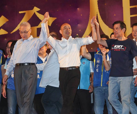 國民黨2020臺灣地區(qū)領(lǐng)導(dǎo)人選舉提名人韓國瑜(中)8日在新北市三重幸福水漾公園舉辦“2020新北出發(fā)”晚會,前臺灣地區(qū)領(lǐng)導(dǎo)人馬英九(右)與國民黨主席吳敦義(左)牽著韓國瑜的手,現(xiàn)身力挺。(圖片來源:臺灣“中時電子報”)
