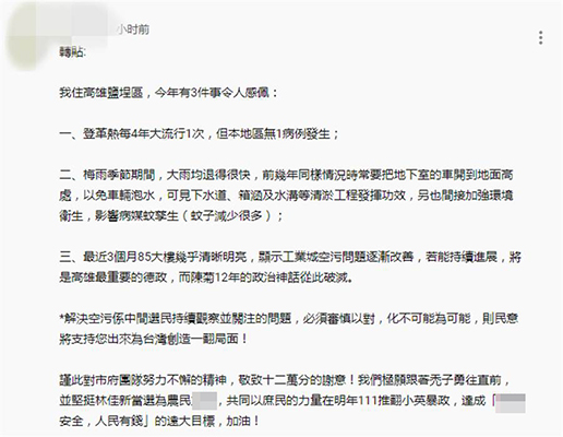 該網友更對高雄市府表示深深的感謝,對市府團隊努力不懈的精神敬致十二萬分的謝意!他說,“我們極愿跟著禿子勇往直前,并堅挺林佳新當選為農民‘立委’,共同以庶民的力量在明年111(1月11日)推翻小英暴政,”達成“臺灣安全,人民有錢”的遠大目標,加油!