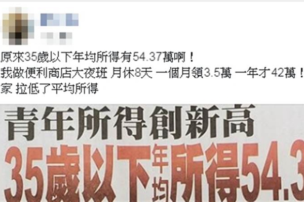有網友轉發新聞,說“原來35歲以下年均所得有54.37萬啊!我做便利商店大夜班,月休8天,一個月領3.5萬,一年才42萬!我對不起大家,拉低了平均所得!