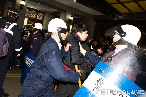 “太陽花學運”期間占領(lǐng)“行政院”運動爆發(fā)警民沖突。(圖片來源:臺灣“東森新聞云”)