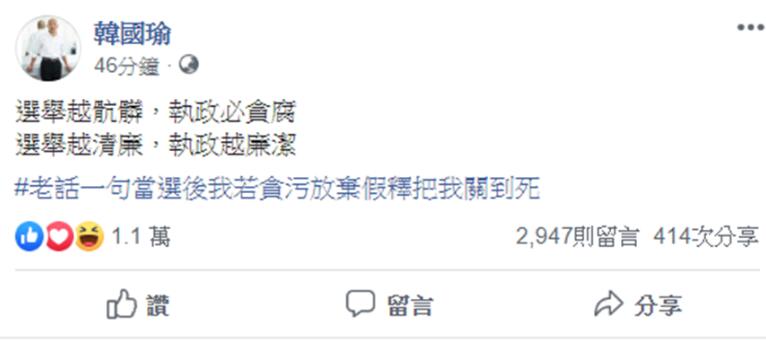 韓國瑜今(30日)在臉譜網(wǎng)發(fā)文,拋出20字新口號:“選舉越骯臟,執(zhí)政必貪腐。選舉越清廉,執(zhí)政越廉潔”,并標(biāo)記“老話一句,當(dāng)選后我若貪污放棄假釋,把我關(guān)到死”。