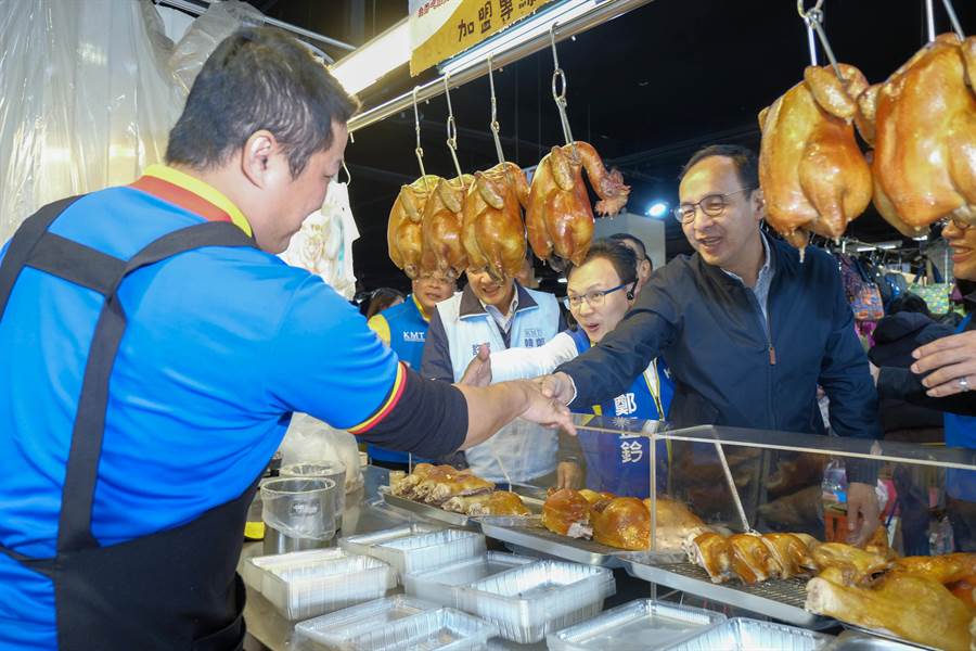前新北市長(zhǎng)朱立倫(右)陪同“立委”參選人鄭正鈐(左)在竹蓮市場(chǎng)拜票,向攤商握手懇托支持韓國(guó)瑜。(圖片來(lái)源:臺(tái)灣“中時(shí)電子報(bào)”)