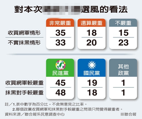 臺灣《聯合報》進一步分析發現,在“蔡賴配”支持者中,各有近20%認為民進黨在收買網軍及抹黑對手上操作負面選舉的情況更嚴重。
