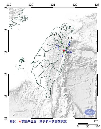 其他地區:宜蘭縣震度3級,南投縣、臺中市地區最大震度2級,桃園市、新竹縣地區最大震度1級。(中國臺灣網 李寧)