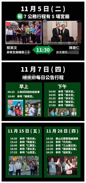鄭照新還攤出蔡英文辦公室公布的詳細(xì)行程表,證明蔡英文有多天幾乎全天不斷跑場(chǎng)在參拜各地宮廟。他痛批,這是蔡英文辦公室官方公布的公務(wù)行程,還是日常上班時(shí)間,旁邊的“立委”候選人身披競(jìng)選戰(zhàn)袍,甚至公開拉票,這難道沒有違反行政中立嗎?