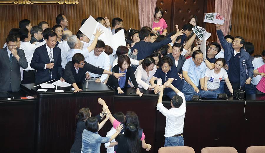 目前,臺灣島內存在近300個政黨。民進黨當局祭出的“政黨法”,將使眾多“一人政黨”或“僵尸政黨”難以生存。圖為臺“立法院”亂象。(圖片來源:臺灣“中時電子報”資料圖)