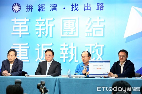 韓國瑜競選辦公室召開“臺灣經濟大好,你信嗎?!”記者會。(圖片來源:臺灣“東森新聞云”)