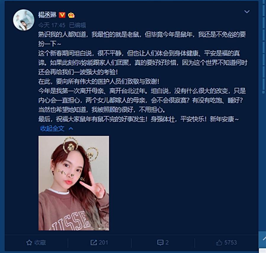 楊丞琳同時也對前線醫(yī)療人員致上敬意,并表示:“今年是我第一次離開母親、離開臺北過年。坦白說,沒有什么很大的改變,只是內(nèi)心會一直擔(dān)心,兩個女兒都嫁人的母親,會不會很寂寞?有沒有吃飽、睡好?當(dāng)然也希望她知道,我被照顧的很好,不用擔(dān)心。”