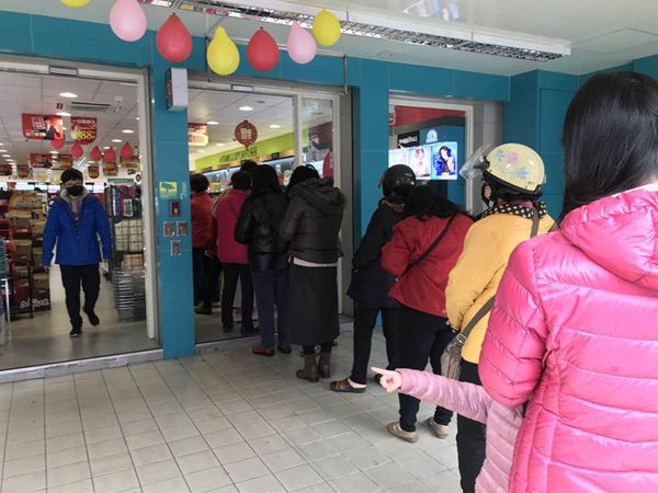 宜蘭市某連鎖藥妝店涌入大量搶購(gòu)口罩的民眾,排成的隊(duì)伍從店內(nèi)拉到店外的馬路上。(圖片來(lái)源:臺(tái)灣“中時(shí)電子報(bào)”)