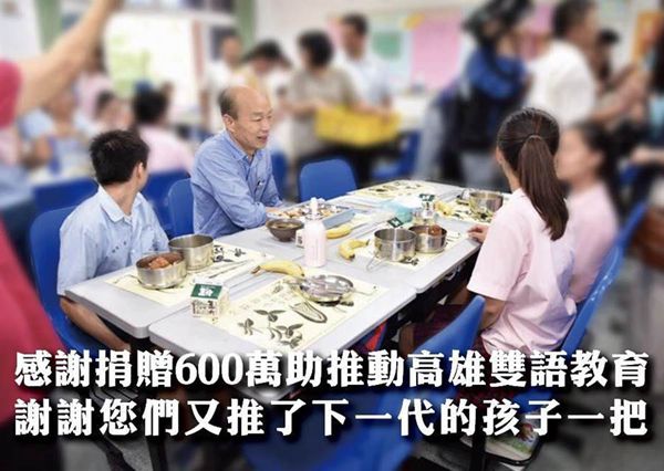 韓國瑜昨日在臉譜網(wǎng)上感謝一位不具名的黃小姐,表示她為了支持高雄的雙語教育,匿名捐款了600萬元(新臺幣)。韓國瑜表示,這筆錢絕對不是一筆小數(shù)目,但是黃小姐卻毅然決然的托付給韓國瑜,可見她擁有著與他一樣,希望下一代能更好的決心。