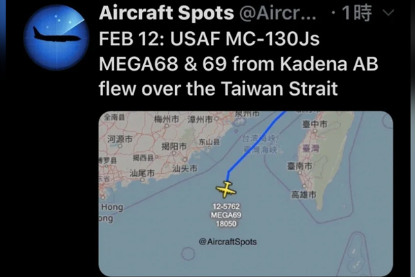 中國臺灣網2月12日訊 據臺灣“聯合新聞網”報道,美國社交媒體賬號”飛機守望”12日披露,美國空軍兩架編號MEGA68、MEGA6869的MC-130J特戰運輸機,今天中午沿臺灣海峽中線,由北向南飛行,穿越臺灣海峽上空。根據該社交媒體賬號披露的航跡,未交待兩機最后去向,但根據過去慣例,通常是飛返嘉手納基地。