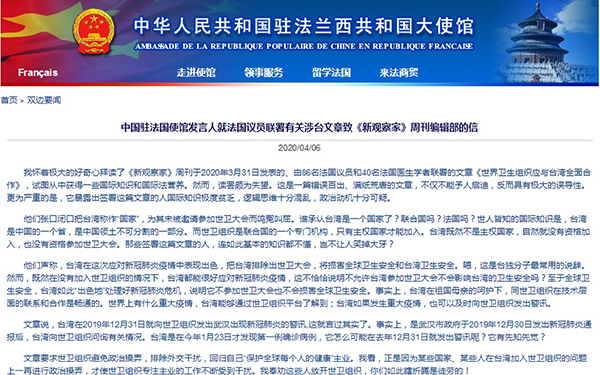 4月6日,中國駐法國使館官網刊文《中國駐法國使館發言人就法國議員聯署有關涉臺文章致<新觀察家>周刊編輯部的信》。(圖片來源:中國駐法大使館官網)