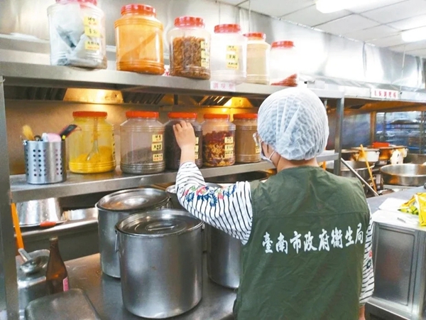臺(tái)南市衛(wèi)生局人員前往新化高中供餐廠商廚房,調(diào)查學(xué)生集體腹瀉原因。 (圖片取自臺(tái)媒)