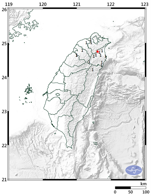 各地震度級:宜蘭縣、新北市、桃園市、新竹縣、花蓮縣、苗栗縣1級。(中國臺灣網 李寧)