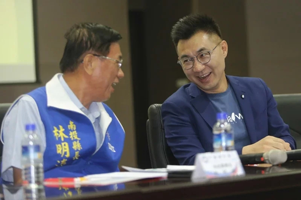 國民黨行動中常會昨天在南投舉行,黨主席江啟臣(右)與南投縣長林明溱(左)討論黨務規(guī)劃。(圖片來源:臺灣《聯(lián)合報》)