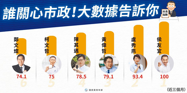 國民黨公布“六都”市長指數 侯友宜勇奪第一