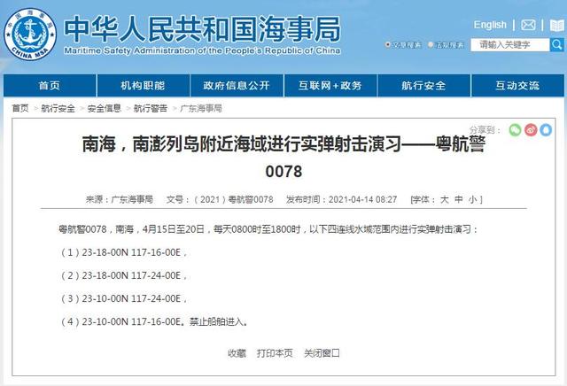 海事局宣布在南海、南澎列島附近進行實彈射擊演習 美司令再提“軍事威脅”論。(圖片來自官網截圖)