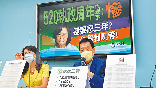 民進黨當局連任后,從去年開放“萊豬”、關閉中天新聞臺,到今年臺鐵太魯閣號事故、興達電廠接連跳電、疫情嚴峻疫苗數量卻不足等,引發臺灣民怨沸騰。國民黨中央昨日盤整民進黨當局這一年來施政表現,直指“缺水、缺電、缺疫苗、黑道執政、食安破功”已成為民進黨施政最鮮明的印象。